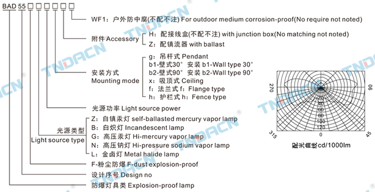 5.可配装白炽灯、汞灯、高压钠灯、金卤灯;