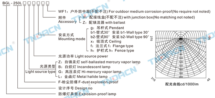 5.可配装白炽灯、汞灯、金卤灯;