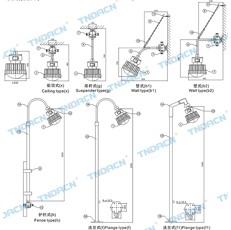 | 1.20区、21区、22区危险场所; 2.可燃性粉尘环境; 3.户内、户外(IP54、IP65*); 4.温度组别:T1~T4/T5/T6; 5.可配装白炽灯、汞灯、高压钠灯、金卤灯; 6.应用于石油、化工、航天、军工等场所。 |