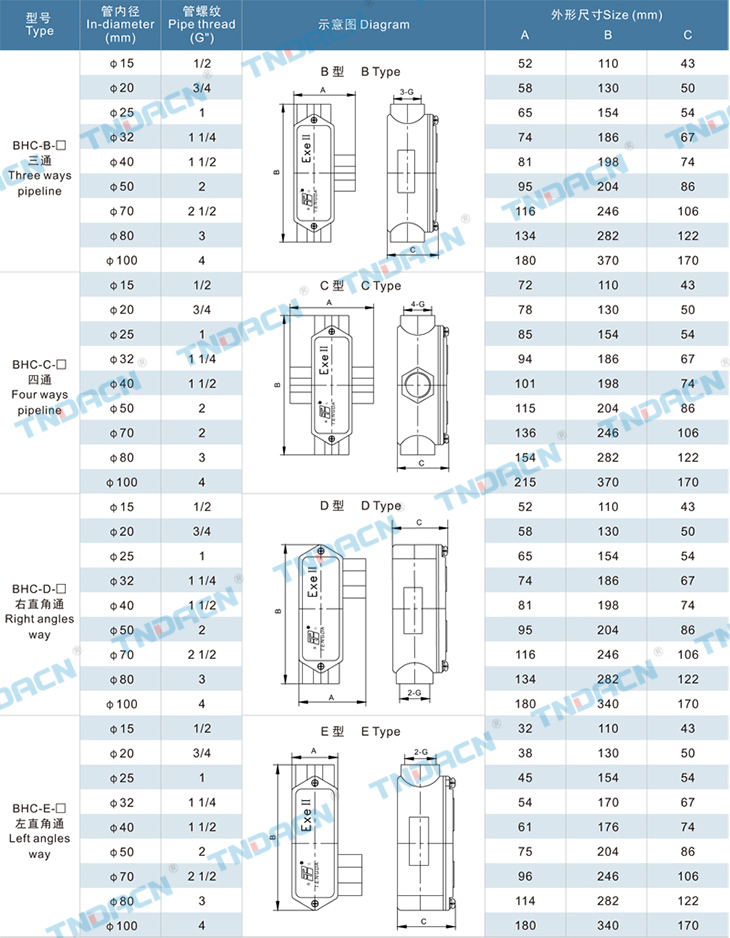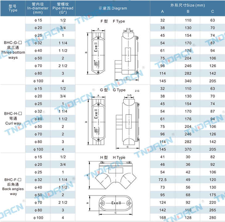 1.壳体采用高强度铝合金一次性压铸成型,表面经高速抛丸清理后高压静电喷塑。外壳结构紧凑合理、材质密度高强度好、防爆性能优良,表面塑粉附着力强,具有良好的防腐能力,表面光洁,美观大方; 2.结构形式多样,便于安装; 3.进出线口螺纹可特制。 1.Shell made of high strength aluminum alloy casting off thesurface after blast cleaning by high voltage electrostaticspray. Shell compact structure, high density materialstrength, Explosion-proof performance, the surface ofplastic power adhesion ability with good anti-corrosion,the surface smooth, elegant appearance. 2.The structures are various, which are convenient forinstallation; 3.Thread specification can be specially designed.